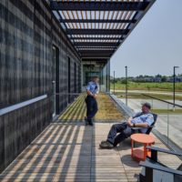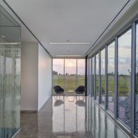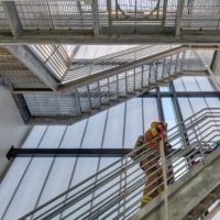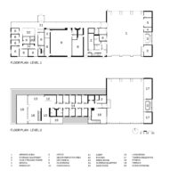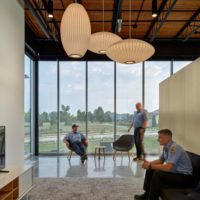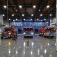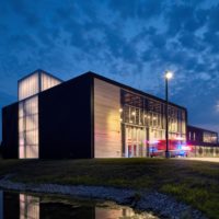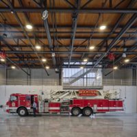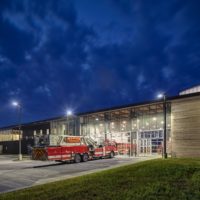 Strategically arranged spaces, including a decontamination area, are positioned between the apparatus bays and the office and living areas to minimize exposure to fire and ash carcinogens, thereby safeguarding the firefighters’ health. On the opposite side of the bays, there is a hose-drying tower that also serves as a training area for simulated rescues. Additional training opportunities are provided in the exterior area, where a retention pond is used for ice rescue exercises.