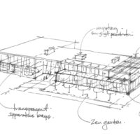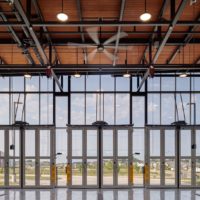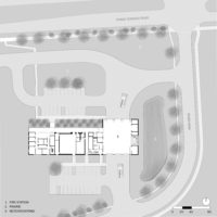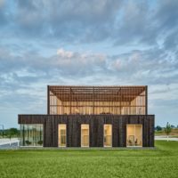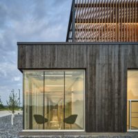 The Marion Fire Station features a two-story apparatus bay at its core, serving as the focal point of the layout. On both the north and south sides, tall glass doors maximize natural light and foster a strong connection to the surrounding community. On the eastern side, the use of shou sugi ban wood, a technique that chars wood with controlled fire, adds depth, texture, and contrast to the smooth glass surfaces in the living and office areas. Additionally, there are two ipe wood terraces with roof and wall trellises, and a green roof covers all living and sleeping spaces.