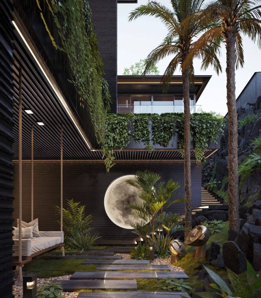 Tall plants, long curtains, and vertical panels enhance the sense of height.