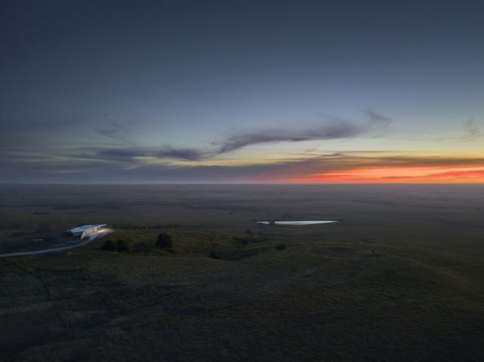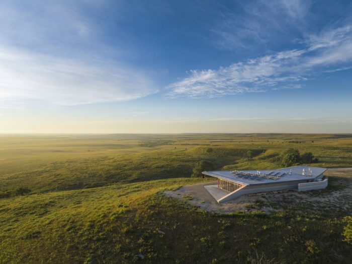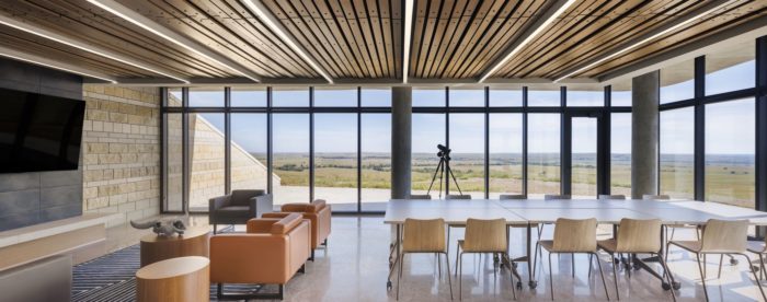 Alright, check this out: We’ve built the whole Youngmeyer Field Station – even the roof – with solid concrete, and we’ve covered it in tough, non-flammable materials like concrete, limestone, and glazing systems to guard against the wind and wildfires. Being a fantastic neighbor in the Flint Hills means not messing with the amazing views, so we kept things sleek and clean. Our concrete roof goes all fancy with a taper at the edge, almost vanishing when you peek at it from the nearest neighbor’s place a few miles down the road. We’re all about fitting in and keeping things low-key.